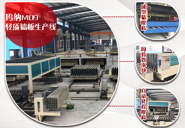 針對輕質隔墻板加工生產過程中出現的勞動強度大,生產成本高,沒有實現自動化生產及存在安全隱患等問題,瑪納公司提供一種全自動輕質隔墻板生產線M09輕質墻板生產線,新型輕質隔墻板設備價格?瑪納生產線投資幾十萬到幾十萬不等,該生產線是在瑪納研制的機動成組立模墻板成型工藝的基礎上,經過技術升級創新,研制出的新型輕質墻板生產線,該生產線具有質量可靠,投資回報率高,能夠實現自動化生產,節約了大量人力物力,避免了輕質隔墻板加工生產過程中出現的勞動強度大,生產成本高,沒有實現自動化生產及存在安全隱患等問題。