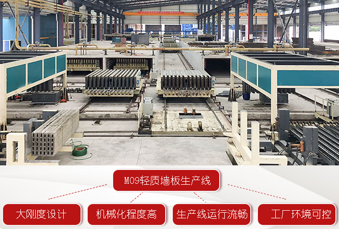 M09輕質墻板生產線是在瑪納研制的機動成組立模墻板成型工藝的基礎上,經過技術升級創新,研制出的新型輕質墻板生產線,該生產線具有“成型精度高,周轉效率快,自動化程度高”等優勢,質量可靠,投資回報率高。